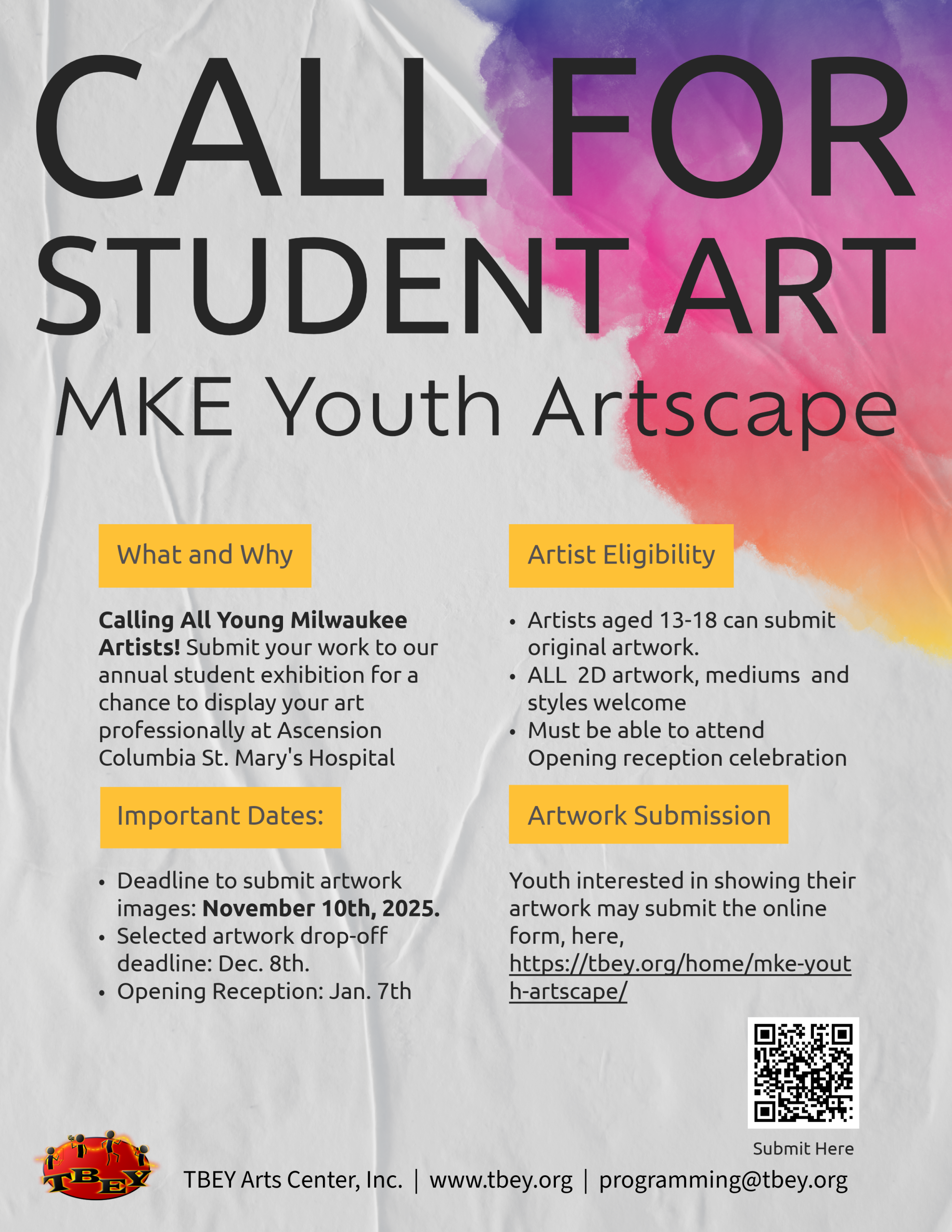 TBEY Arts Center encourages youth to join our annual student art exhibition, MKE Youth Artscape. We will be showcasing selected artworks in early Spring 2026! To be considered for the exhibition, submit images of your artwork by November 10th. Chosen artists drop-off their pieces by January 21st.
