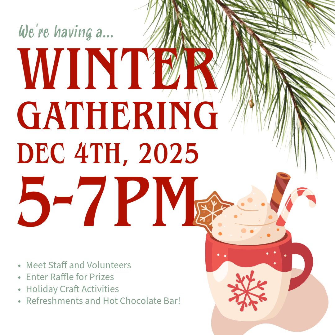 We are having a winter gathering and craft night! Our doors are open for the community to learn about who we are and what we do. Guests will also learn how to create winter-themed craft to take home. Adults and children are welcome to participate and enjoy our hot chocolate bar!